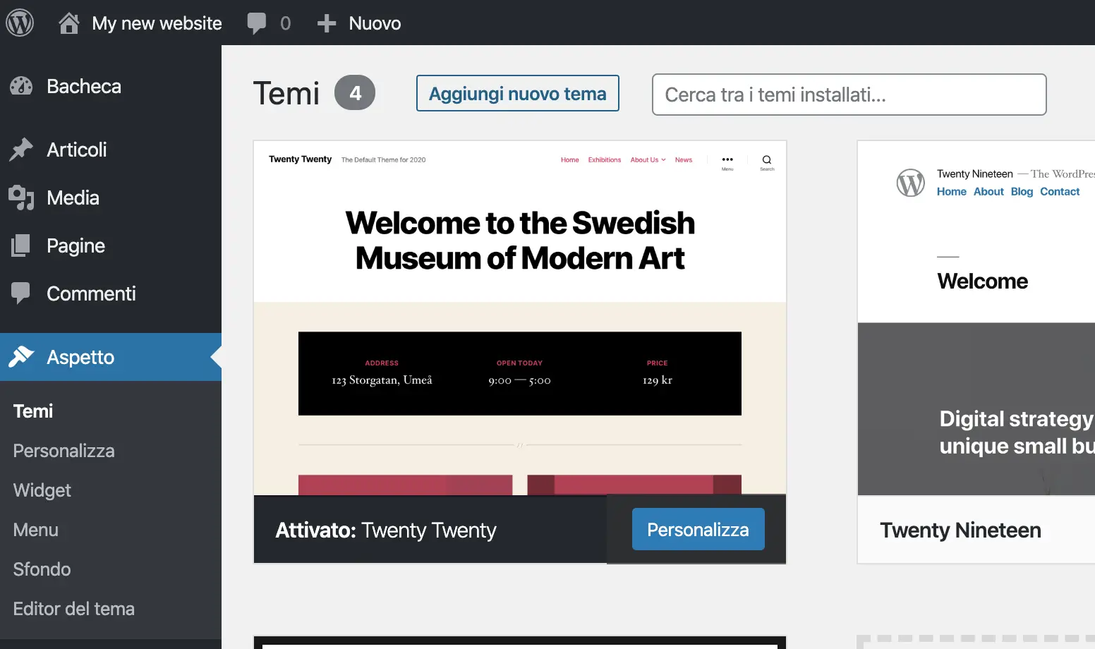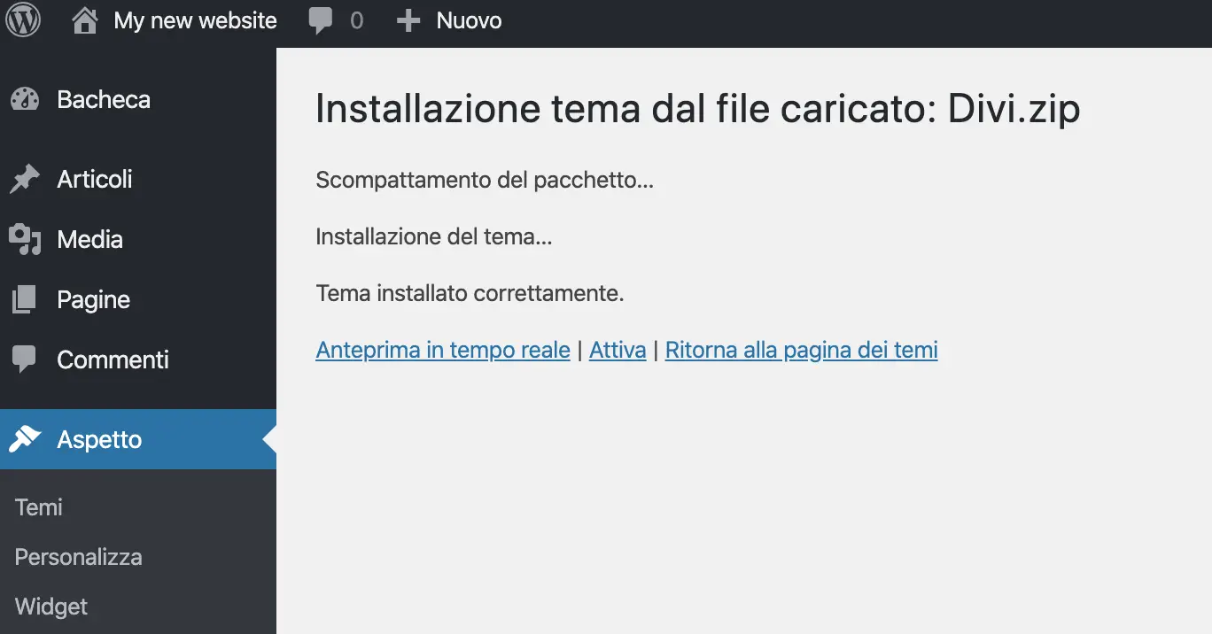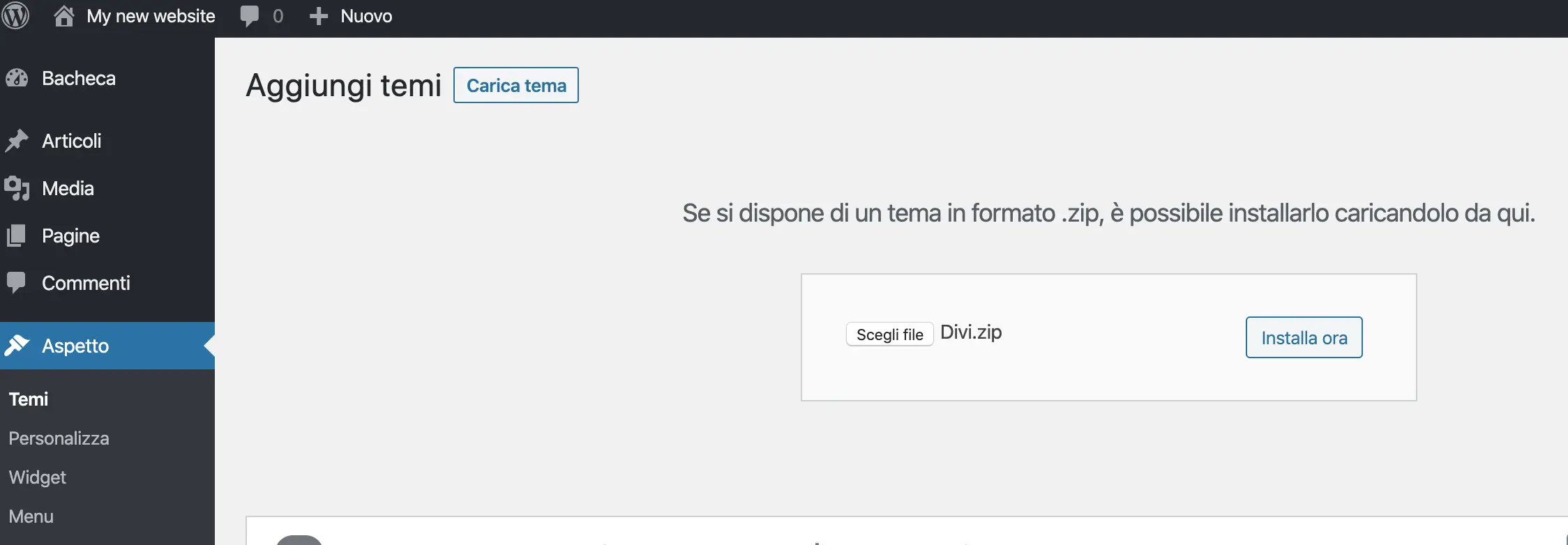 - Dall’amministrazione WordPress vai su Aspetto > Temi > Aggiungi nuovo Tema