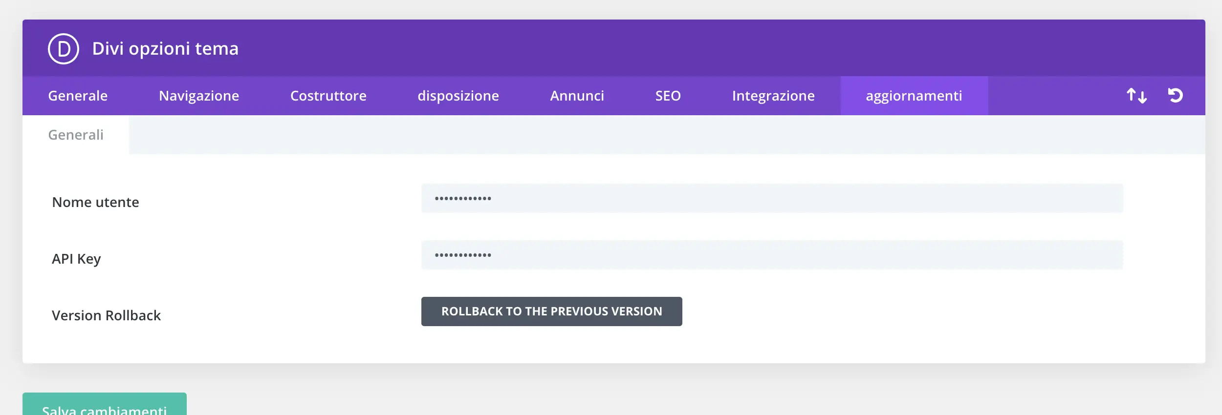 - Qui vai sul tab Aggiornamenti e inserisci il tuo nome utente e l’api key che hai appena copiato. Salva cliccando sul pulsante “Salva i cambiamenti”, e d’ora in avanti riceverai tutti gli aggiornamenti rilasciati da Divi