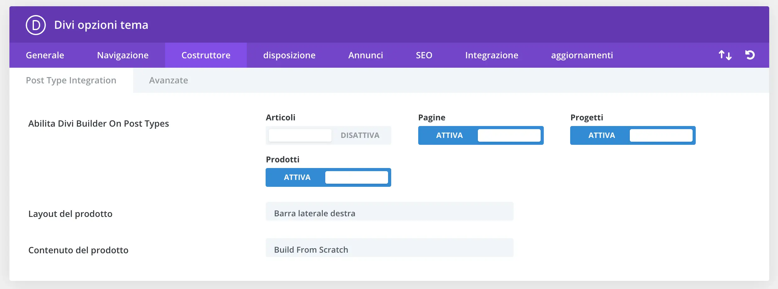 - Vai su Divi > Opzioni tema e seleziona il tab Costruttore e, rimanendo sul tab Post Type Integration, disabilita Divi per gli articoli