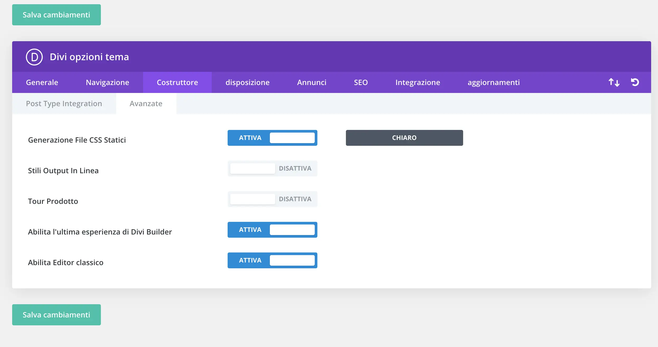 - Adesso passa al tab Avanzate e metti Attiva su Abilita l’ultima esperienza di Divi Builder e Abilita Editor classico