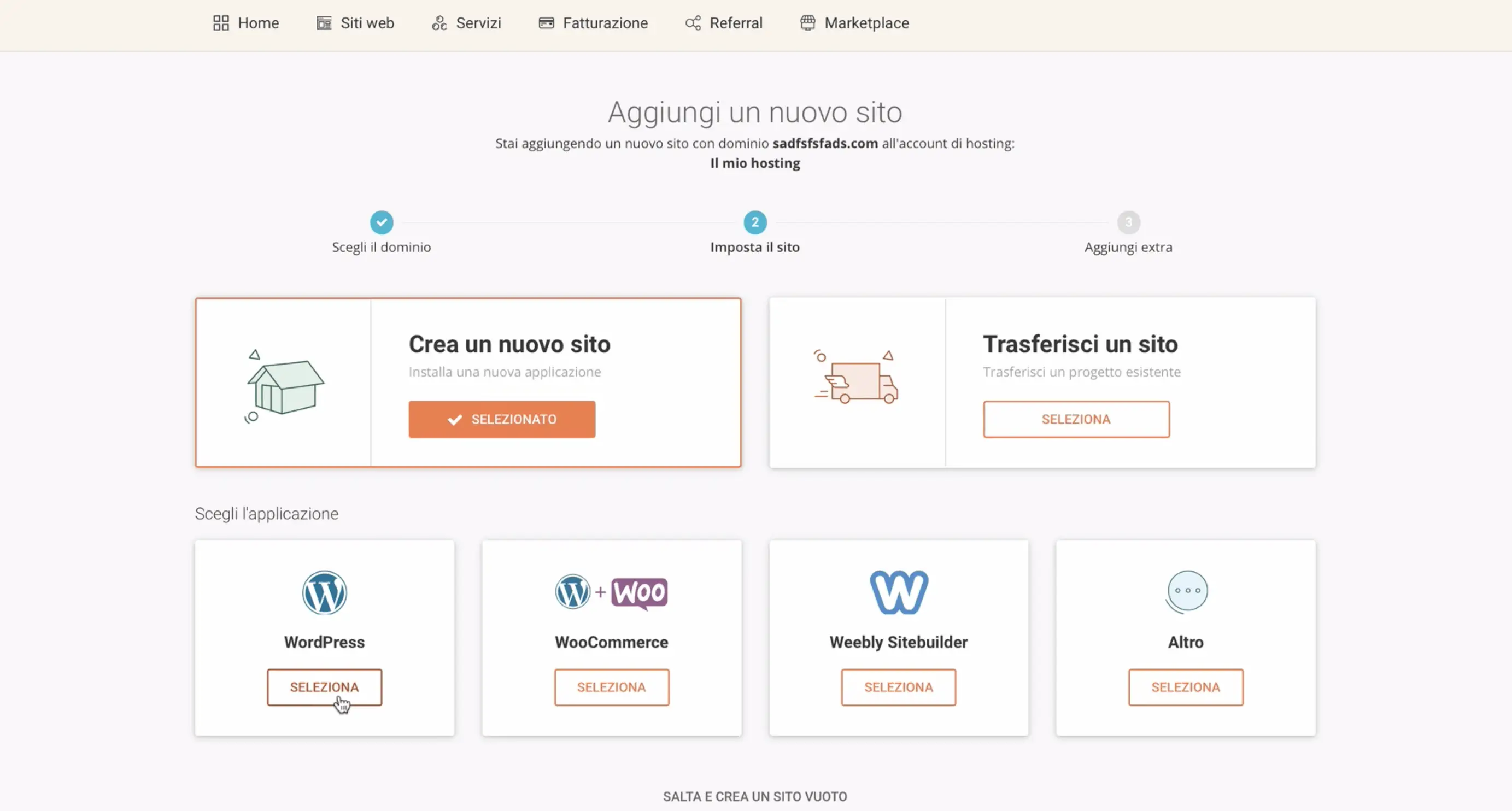 Dopo aver eseguito le prime fasi di acquisto dell’hosting, per creare un sito da zero , seleziona WordPress, o WordPress + Woocommerce (se si tratta di un e-commerce).