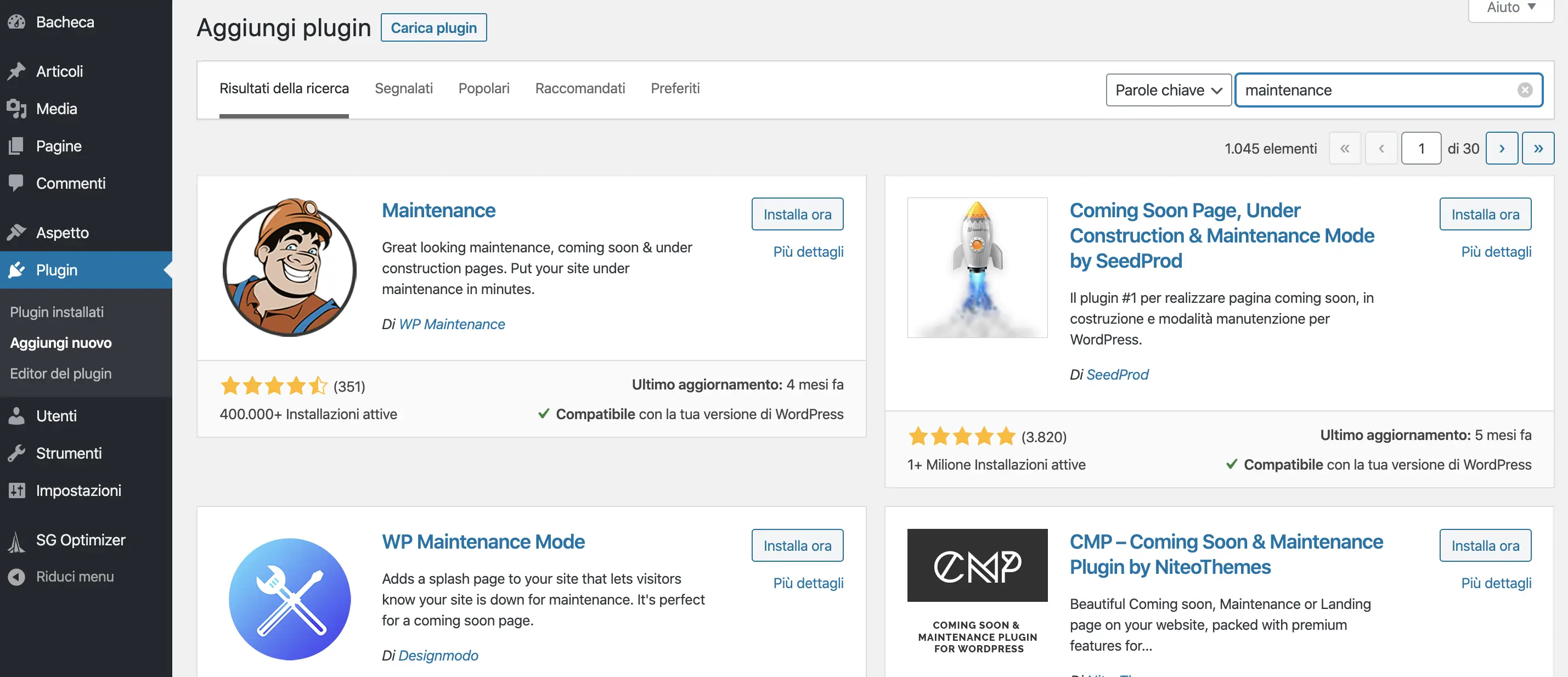 3. Clicca “Installa” sul primo plugin della lista che appare, quello che si chiama Maintenance. Dopo il pulsante Installa si trasformerà in Attiva. Clicca su Attiva.