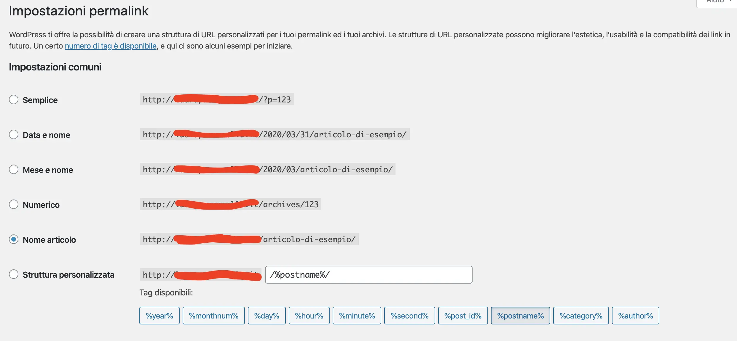 2. Controlla che la selezione sia su una struttura tipo dominio/nome-articolo, oppure dominio/categoria/nome-articolo. Una di queste andrà benissimo. L’importante è che non sia selezionata la struttura tipo semplice (dominio/?p=123)