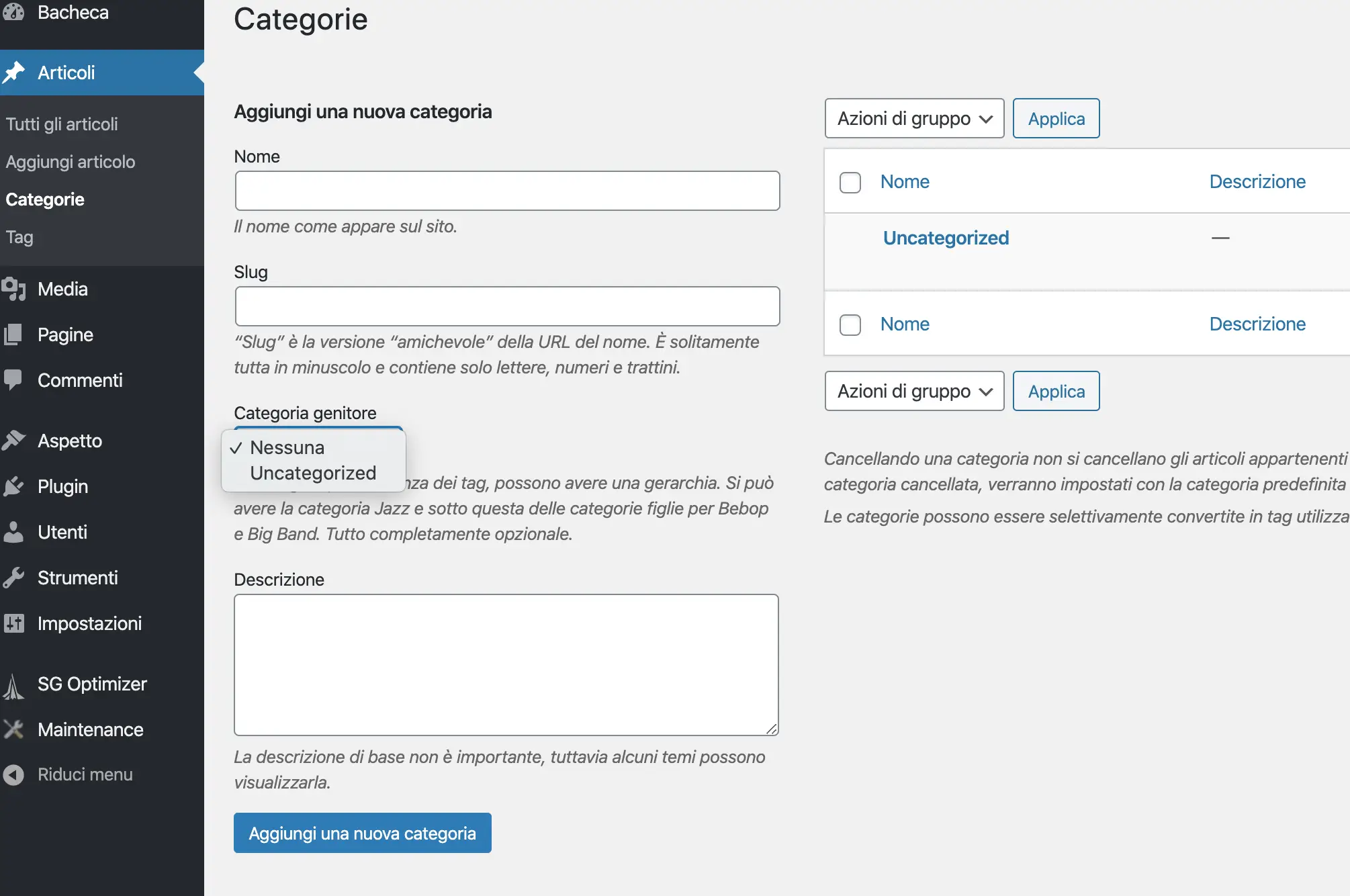 • Dal menu vai su Articoli – Categorie. Si aprirà una schermata in cui inserire il nome della categoria, lo slug (cioè la parte di url relativa a quella categoria) e la descrizione.