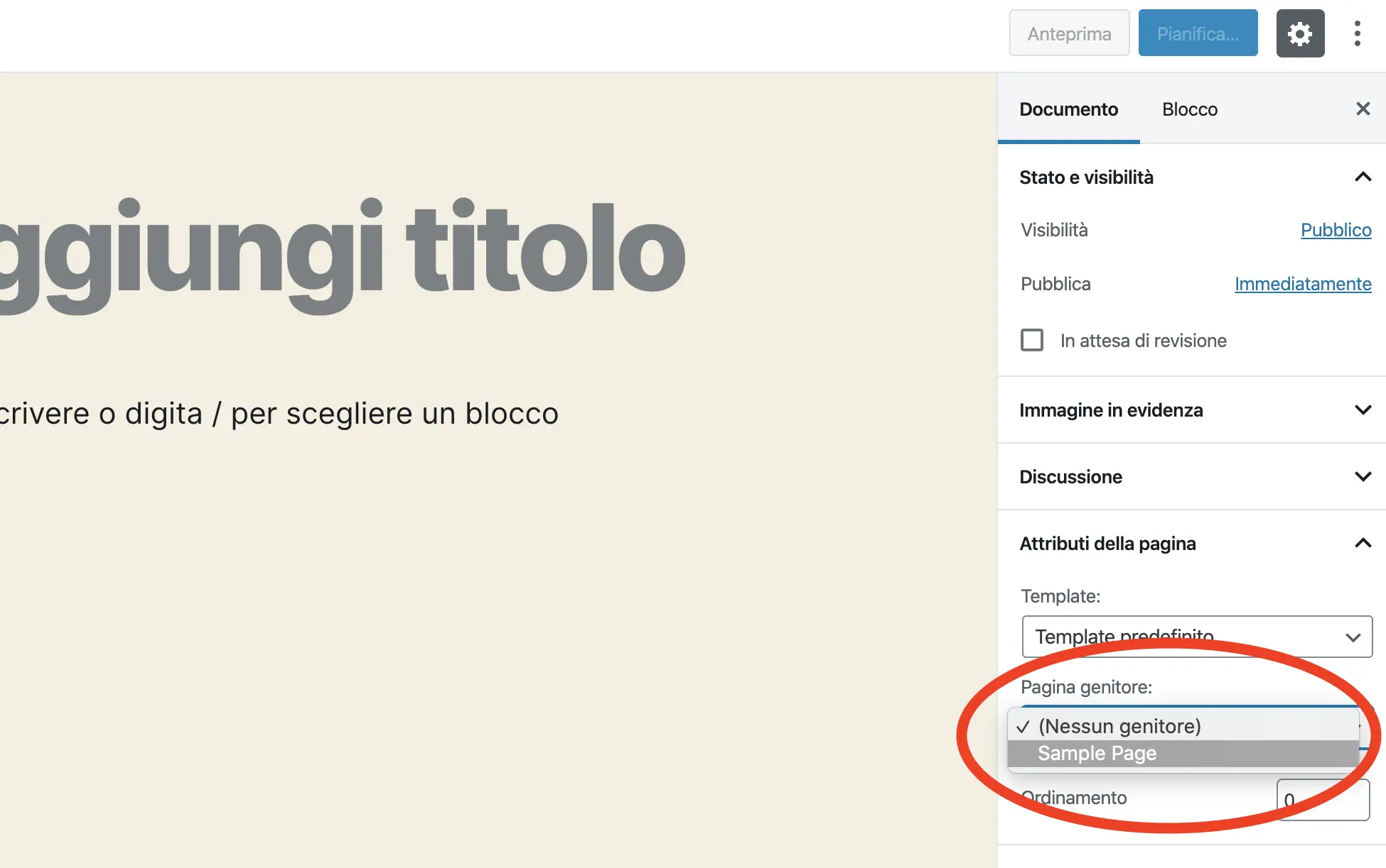 All’interno della schermata di creazione di una Pagina, troviamo una colonna a destra contenente dei moduli. Tra questi moduli ce n’è uno che si chiama Attributi della pagina. Qui troviamo la tendina che ci chiede se la pagina che stiamo creando ha un Genitore.
