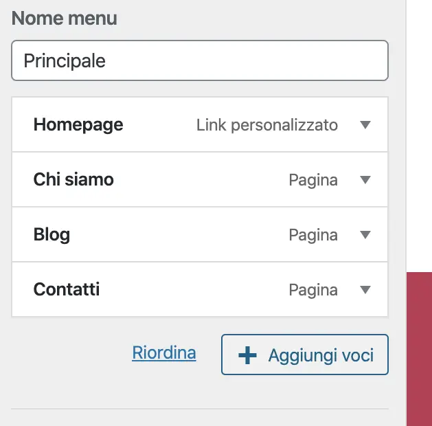 • Cliccando su Menu potrai aggiungere le voci di menu selezionando le pagine che hai creato. Basterà cliccare su + Aggiungi voci per scegliere il tipo di voce da aggiungere (in questo caso Pagine) e selezionarla.